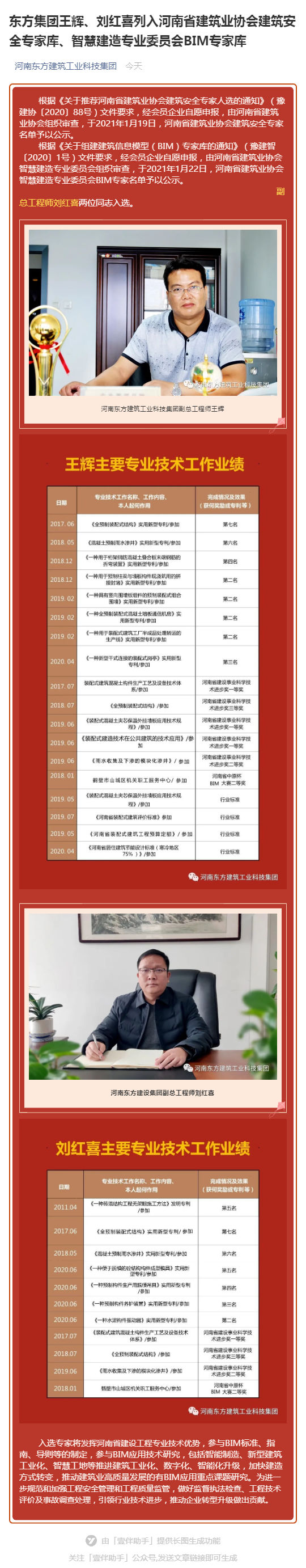 東方集團(tuán)王輝、劉紅喜列入河南省建筑業(yè)協(xié)會建筑安全專家?guī)臁⒅腔劢ㄔ鞂I(yè)委員會BIM專家?guī)?