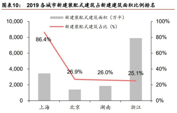 分區(qū)域來看,當前上海裝配化率水平最高,浙江、湖南等地裝配式建筑發(fā)展領先,區(qū)域之 間的差距較為明顯。從政策重點推進和積極鼓勵推進的地區(qū)發(fā)展來看,區(qū)域經濟發(fā)展程度、 政策措施支持力度以及相關產業(yè)配套完善程度決定了裝配式建筑發(fā)展水平。根據住建部數 據,2017-2019 年,重點推進地區(qū)(京津冀、長三角、珠三角三大城市群)新開工裝配式 建 筑 面 積 分 別 為 0.75/1.35/1.97 億 m2, 占 全 國 新 開 工 建 筑 面 積 的 比 例 分 別 為 47.2%/46.8%/47.1%。19 年末上海的新建建筑中裝配式建筑占比最高,已達到 86.4%的 水平,北京、湖南、浙江的占比均超過 25%,分別達到 26.9%/26.0%/25.1%,江蘇、天 津、江西等地占比則超過 20%。