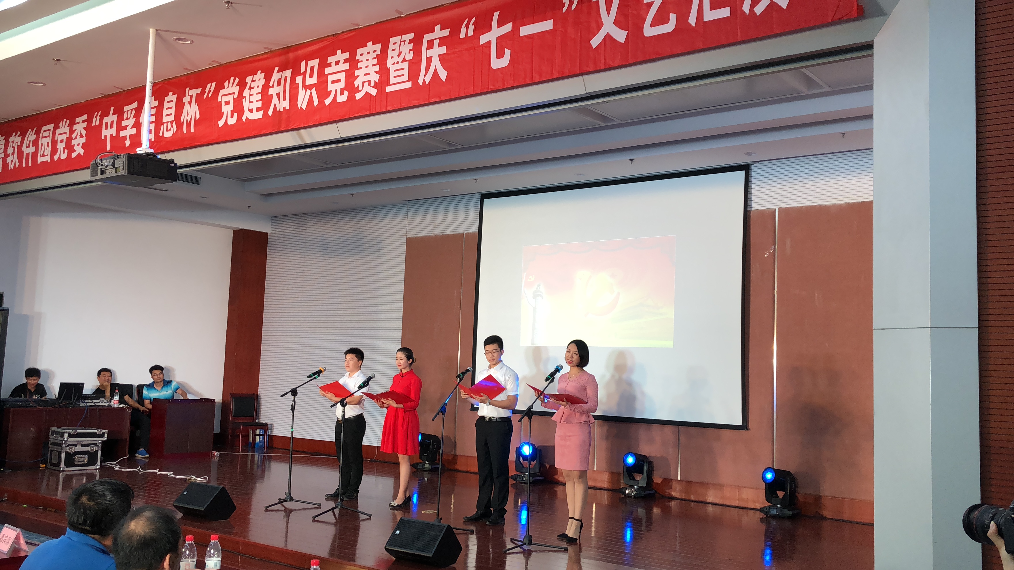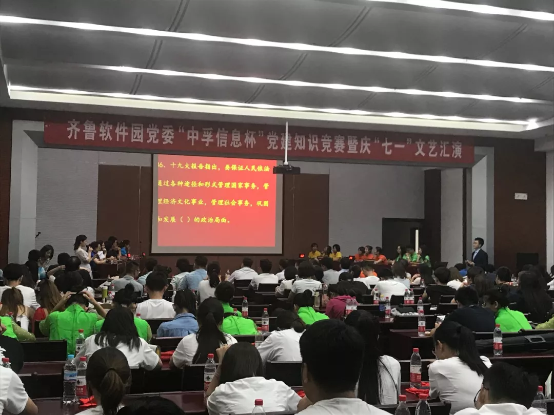 为庆祝中国共产党成立97周年,深入推进党的十九大精神学习,2018年6月30日下午,太阳成集团tyc33455cc党总支响应齐鲁软件园党委号召,组织并参与了“太阳成集团tyc33455cc杯”党建知识竞赛暨庆“七一”文艺汇演活动,为党的97岁华诞献礼。园区企业联合党委下属企业党组织成员、党建指导员等200余人参加了此次活动。